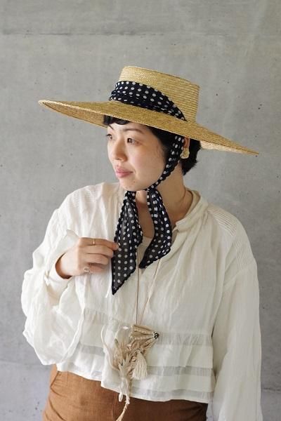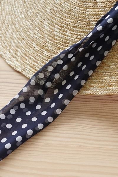 ハットの前面に通された水玉リボンがサイドに垂れ下がるデザインで
