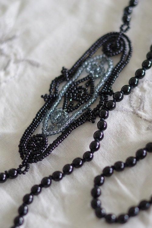 ネック部分は輝きのあるブラックビーズ。